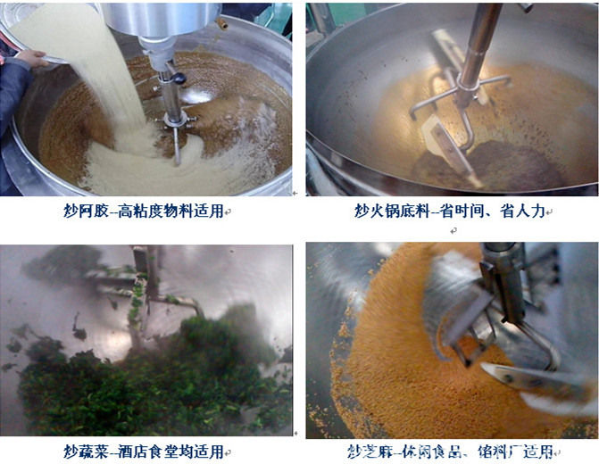 行星攪拌炒鍋攪拌系統采用自轉公轉相結合的方式,其傳動比為不整數傳動比,保證鍋內無任何攪拌盲點。行星攪拌炒鍋可用于炒菜、煮粥、煮筍干、熬湯、燒水、煮飯、化糖、化膠、熬糖稀、熬油、炒餡料(蓮蓉餡、月餅餡、綠豆餡、豆沙餡等)、糕點、飲料、蜜餞、醬料(如:豆瓣醬,甜面醬,花生醬,辣椒醬,牛肉醬、火鍋底料、方便面醬料、香菇醬等)等食品行業以及制藥(藥材和焙烤)與日用化工等行業。不同物料,設計細節不同。