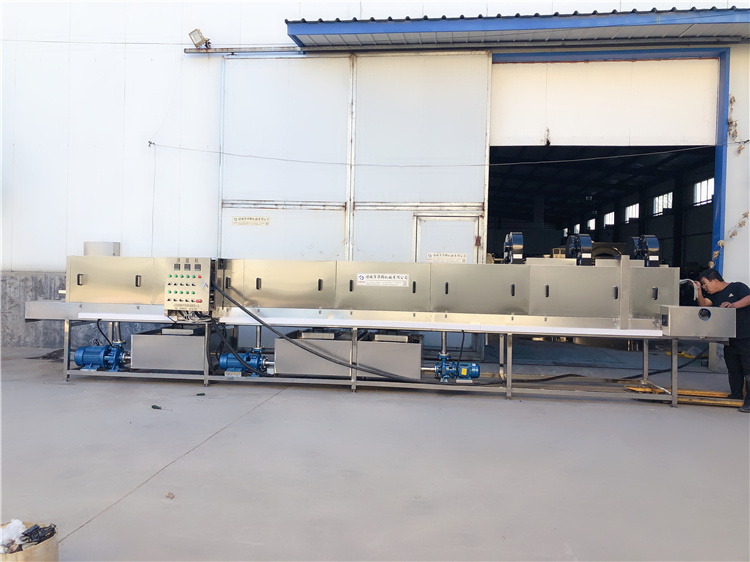 需清洗的周轉筐由不銹鋼鏈條輸入清洗機中,依次通過加溫堿水、高壓熱水、常溫自來水消毒水、常溫風刀去水等多道工序,將筐子清洗干凈,同時完成殺菌及風干;特殊筐子清洗時可在熱堿水清洗段后加配毛刷,對筐子底部及左右兩側進行刷洗,提高清洗效果;采用連續式清洗,以提高清洗效率;