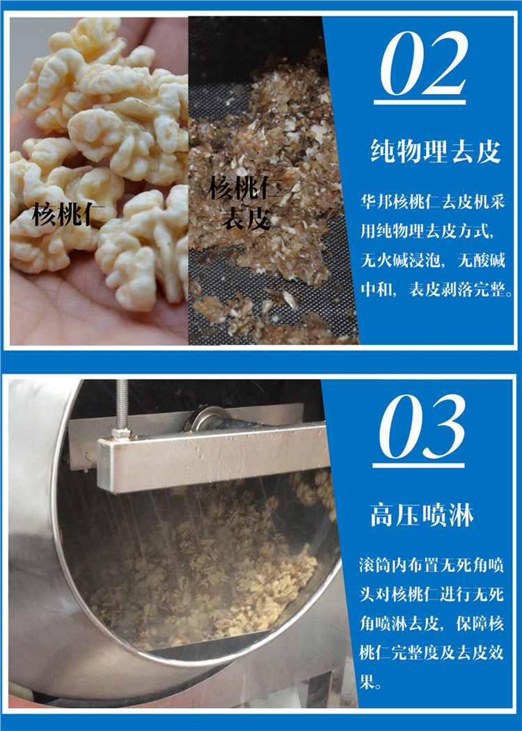 采用特殊設(shè)計(jì)的脫皮原理,脫皮過程中,核桃仁完全不經(jīng)過刀片及硬度磨擦用,所以能確保加工物之完整性、新鮮度及無污染。
