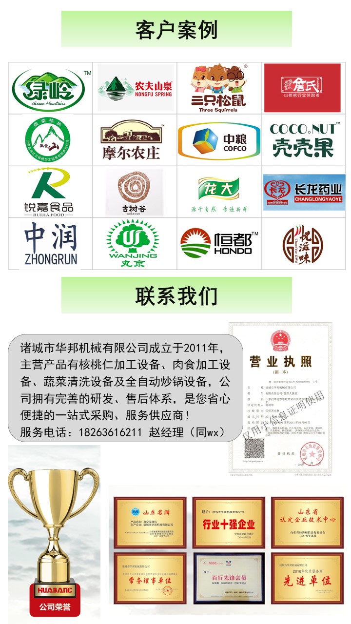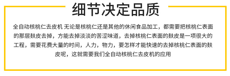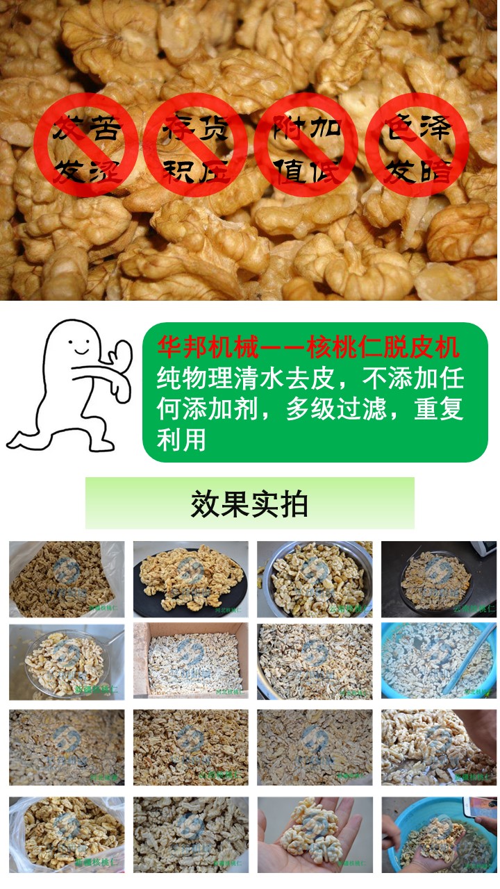 核桃深加工時,需要去掉核桃仁外層的薄皮以脫除苦澀味道。以前工藝較為落后,目前諸城華邦機械的本項創新解決的技術問題是給廣大核桃產業提供一種大幅度提高生產效率、節約用人、純物理脫皮均勻干凈,自動化程度高,不破壞核桃仁內在品質營養成分,不爛、不碎、不損害外形,果仁完整。