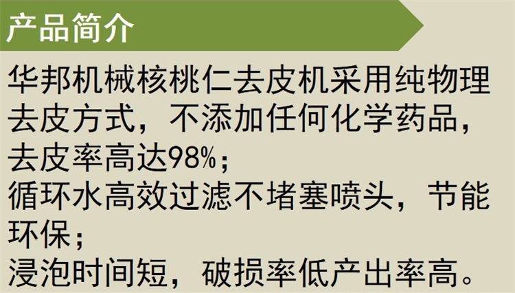 華邦機械十年的制造經驗,根據多年來的研發,試機,客戶的要求進行不斷的完善!最終研發出了第五代核桃仁去皮機 ,自動進料。加大產量,縮短去皮的時間,更容易的將核桃仁皮完全去除!