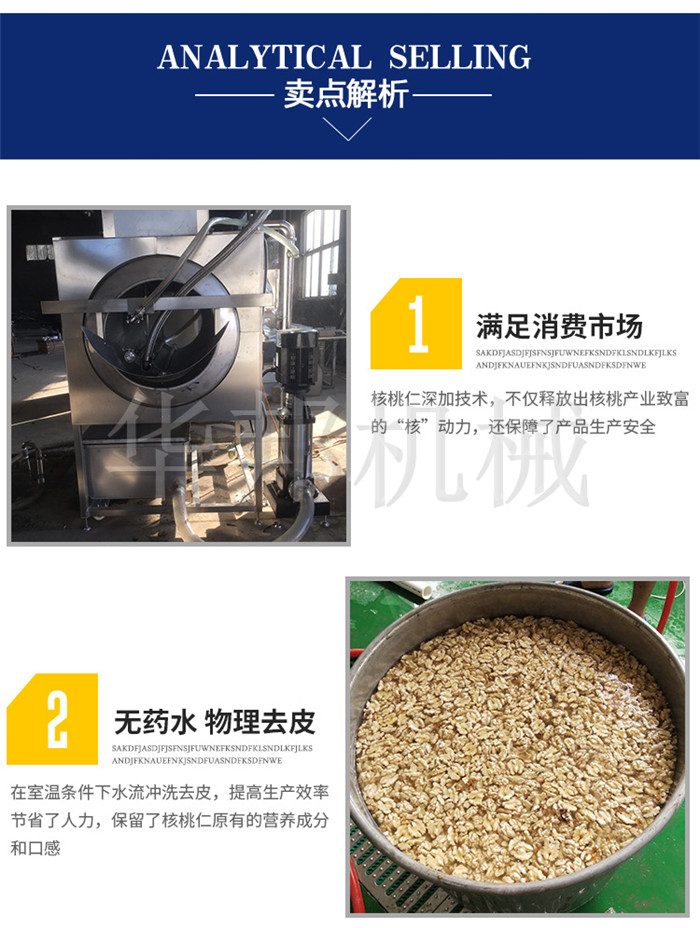 核桃仁的制作流程一般來說新鮮的核桃去掉青皮之后,再去掉硬殼,用水泡一下種仁,把種仁表面的一次淡黃色的內(nèi)種皮去掉,得到的白色種仁再吃就沒有什么澀味了。不去內(nèi)種皮的話,吃起來肯定會比較苦澀,影響口感。華邦機(jī)械新款核桃仁去皮機(jī),采用滾筒式去皮,滾筒占地面積小,但是工作效率高,產(chǎn)量大。采用高壓噴淋清洗,能360度的將核桃仁的凹凸表皮去掉。直接采用自來水等清水去皮,不加藥水,色澤好,口感佳。脫皮時間短,12分鐘左右就可以完全脫掉,0破損,果仁完整。脫皮后的水可以直接排放,0污染